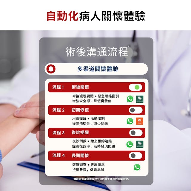 港大研究顯示,術後系統性追蹤能使康復效率提升40%,心理併發症下降35%。我們的醫療體系現時絕對可以將不同的症狀,配合不同跟進的AI支持診症後的溝通流程(Automated Communication Flow)。