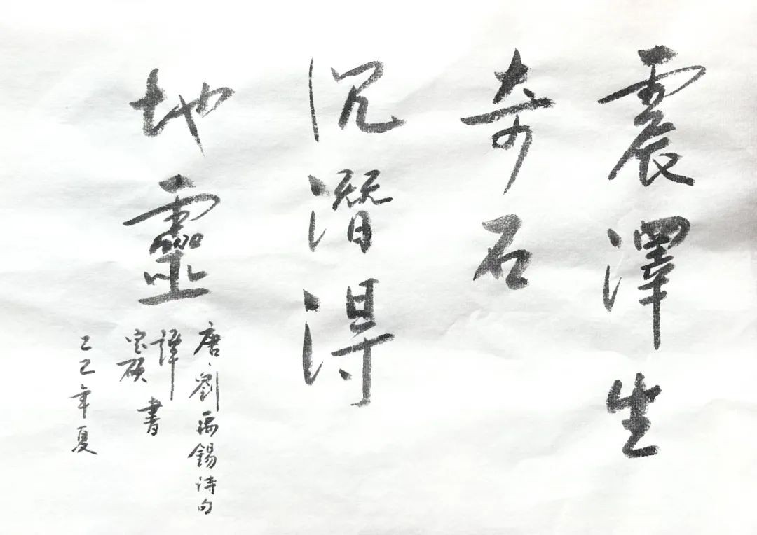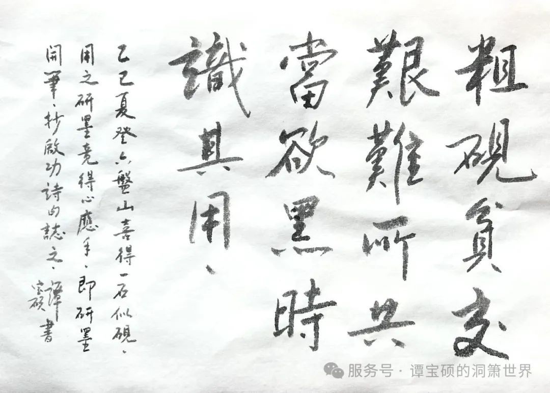 石硯初成,我急不可待拿起墨條研磨,墨條與硯石相撫,低柔如細雨。墨香氤氲,墨汁濃黑,潤澤且豐滿,靜聚於硯池之內。