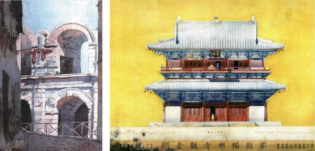 右:梁思成繪薊縣獨樂寺觀音閣南立面水彩渲染圖(1932年),中國文化遺產研究院藏。