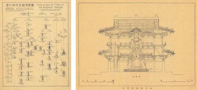 右:梁思成繪製的獨樂寺觀音閣剖面圖。