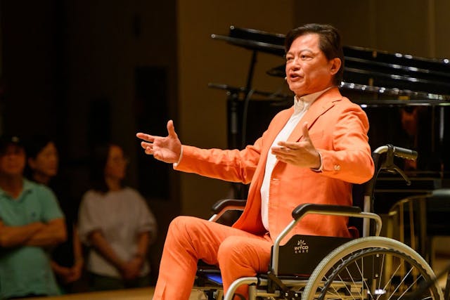 高潮來了,藝術總監莫華倫一身橙色西裝坐着輪椅上台了,原來他之前在新疆演出意外跌傷,但卻堅持要來演唱。他唱的是毛澤東的《七律長征》,全體觀眾都站起來了,「紅軍不怕遠征難,萬水千山只等閒⋯⋯」他渾厚通亮的聲音與聽眾的掌聲,響徹文化中心音樂廳。