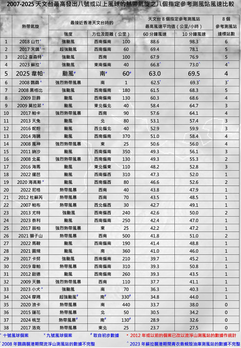 一些朋友都說韋帕的風力偏低,民間氣象組織「香港地下天文台」更製作了自2007年以來8號風球或以上的熱帶氣旋平均風力排名表(圖1)。排名是根據天文台指定的8個參考測風站的平均風速所計算。從(圖1)可見,韋帕排名第5,為21世紀5個十號風球中平均風力最弱的一個,比山竹所帶來的平均風力足足低約3成。