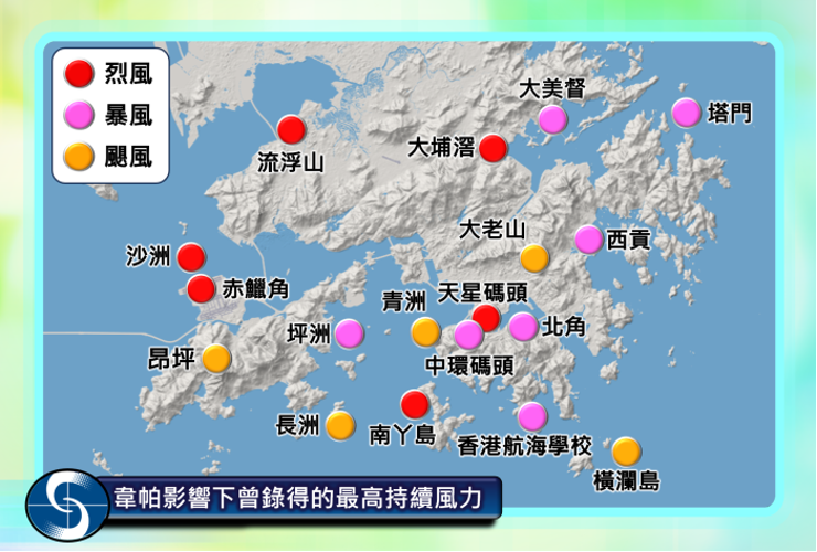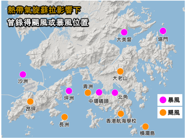 筆者在(圖2) 中將最高和最低值,分別以紅色和藍色標示──有雙底線的是最高/最低值,沒有雙底線的是第二最高/最低值。可見韋帕在九龍市區(京士柏和啟德)的60分鐘平均風速是歷年最弱,這與朋友的觀感一致。但是,若果我們看離岸島站(長洲和橫欄島),韋帕所帶來的風速卻處於中游位置,不是最弱。而天文台在「天氣隨筆」網誌所提供的最高10分鐘持續風力分布更顯示,港島市區(中環碼頭和北角)曾錄得暴風風力(圖3),與2023年「蘇拉」所帶來的風力分布接近(圖4)。這情況亦與韋帕所帶來的東南風較東北風弱有關⋯⋯只是九龍區因地形屏蔽了東北風而沒有感受到最強的風力。