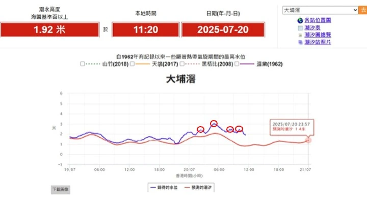 筆者在7月20日韋帕吹襲香港期間,留意到大埔滘潮汐站的潮水高度出現2至4小時周期性的變化(圖5中紅圈),相信這是假潮效應(Seiche Effect)的結果。幸好當天並非天文大潮日子,颱風接近時潮水亦相對較低,韋帕的強度也比較溫黛和山竹弱,因此在吐露港最高風暴潮增水只有約1.5m,最高潮位只有約3mCD;如果有5mCD或以上的潮位(溫黛5.03mCD;山竹4.71mCD),再加上假潮效應會對吐露港沿岸造成重大威脅。