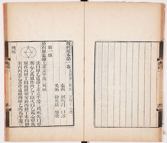 歷史上,中國倒也不是一直都馬馬虎虎。宋朝時期,中國的科技及工業成就完全領先世界,讀一讀李約瑟的《中國科技史》便知。但在明代,西學東漸,中國的領先已不能說得太盡了。歐洲經歷數百年的中世紀「黑暗年代」後,又重新發現了古希臘的文明,而當中歐基理德(Euclid)所彙編的巨著《幾何原本》,更是希臘科技文明集大成之作。