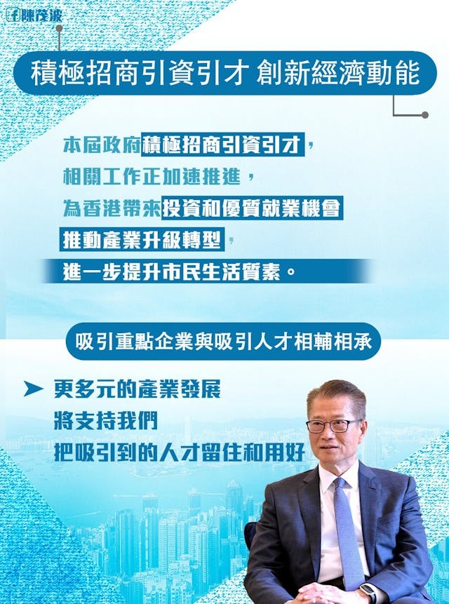 吸引重點企業與吸引人才相輔相承、相互促進。更多元的產業發展,加上優質的就業機會、教育和生活環境,將支持我們把吸引到的人才留住並有好的發展,形成「產業+人才」齊頭並進的良性循環。特區政府會繼續多管齊下,大力引進企業、資金和人才,加速推動香港經濟升級轉型。