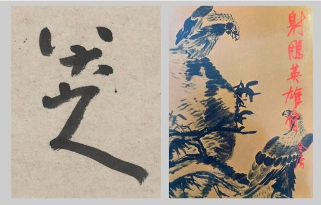 不止於此,藉着正式發表《金庸作品集》之時機,金庸為《射鵰英雄傳》首卷書面選定用林良的「雙鷹圖」。大家可有想過,由張十五帶出「梁師成」這個名字,又用林良的畫做書面絕非巧合。因為將兩件事拼合起來,便明顯不過是作者在暗示「梁林」,而且倒讀「林良」,就不是「梁林」嗎?至於書名是「射鵰」,為何書面卻用「雙鷹圖」呢?也可以肯定並非是因金庸找不到合意的鵰畫。庚戌子打趣去假設:金庸可會考慮過書名用《武林飛鷹傳》呢?不過他最終決定以「射鵰」為名,是要暗示他用「調寫」和「一箭雙鵰」這兩種手法來創作,而且書中滿載着林徽因的故事,又怎會是「無林徽因傳」呢?
