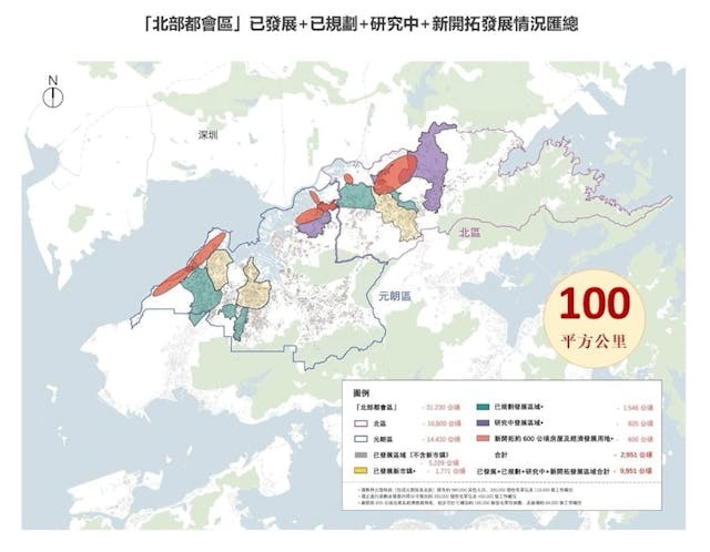 北都涵蓋約312平方公里土地中,大致可分為四類。第一類是已發展的舊村落和新市鎮,佔地約70平方公里。第二類是北都計劃推出前的發展計劃,佔地約16平方公里。第三類是北都計劃推出後的發展計劃,佔地約14平方公里。第四類是未有任何發展計劃的土地,佔地約212平方公里。北都現時約有600條鄉村,生態敏感區域約佔地20平方公里。