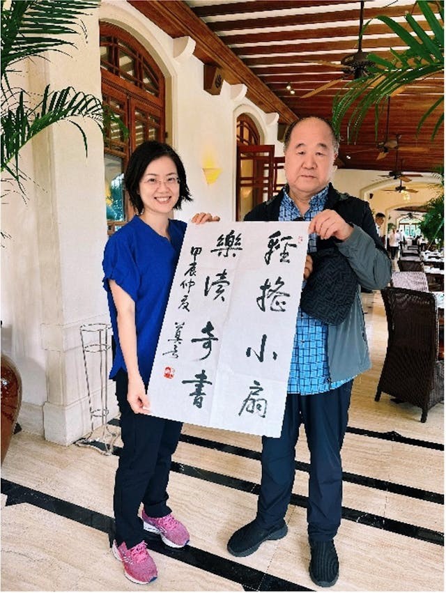 去年8月,莫言來港,贈我一幅墨寶:「輕搖小扇,樂讀奇書。」是副四言對句。小扇、奇書,輕搖、樂讀;靜謐、清幽,不疾、不徐。優雅的氛圍及姿態,讓人陶醉。當其時,我曾暗自思量:自己是否也可以給對上二句?但時隔一年,遲遲未敢獻醜。