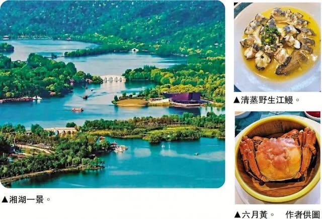 午宴設在湘湖邊跨湖樓,湖光山色襯人間美食。先嚐精美六小碟,熱菜是當地湖江鮮:堂灼江蝦、紅燒錢塘江米魚、野生鱸魚兩吃(骨熬濃湯、陳皮蒸魚肉)、六月黃湖蟹、清蒸野生江鰻、清蒸本塘野生甲魚、火腿蒸小水鴨配米飯、土豬肉燒毛筍、鹽水花蠶豆、石鍋臭乾、鹹肉蛋餃蒸豆瓣、蟶子筍乾燒絲瓜、清炒時令莧菜。烹調並無花巧,吃的是鮮上鮮,如此美景美食,怪不得養出西施這般佳人,更明白范蠡為何辭官歸湖,夫復何求。