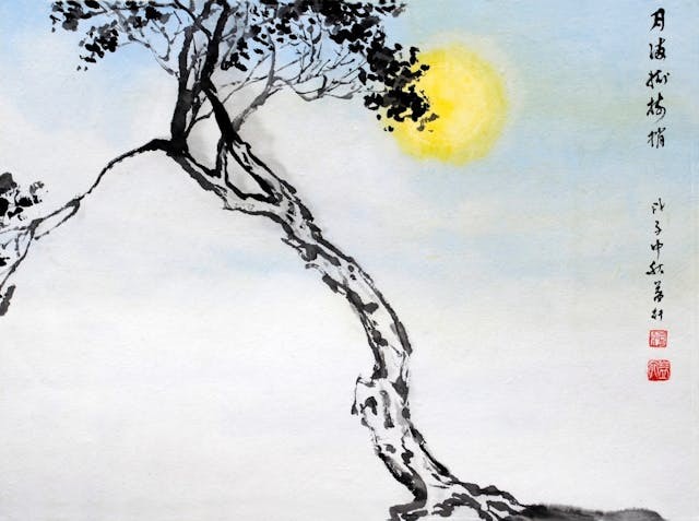 從小被外婆家寵慣了,凡讀書、寫字,或畫畫像做了官,其他人要肅靜迴避,避忌別人旁觀騷擾。2008年中秋,父親忽然提出要看我怎樣用筆,難以拒絕即匆匆潦潦,在極生的宣紙上一氣呵成《月滿掛樹梢》,心卻想着把成語「樹瘦無蔭」、「人窮無親」,更改為「樹瘦可成蔭」、「人弱亦有親」。