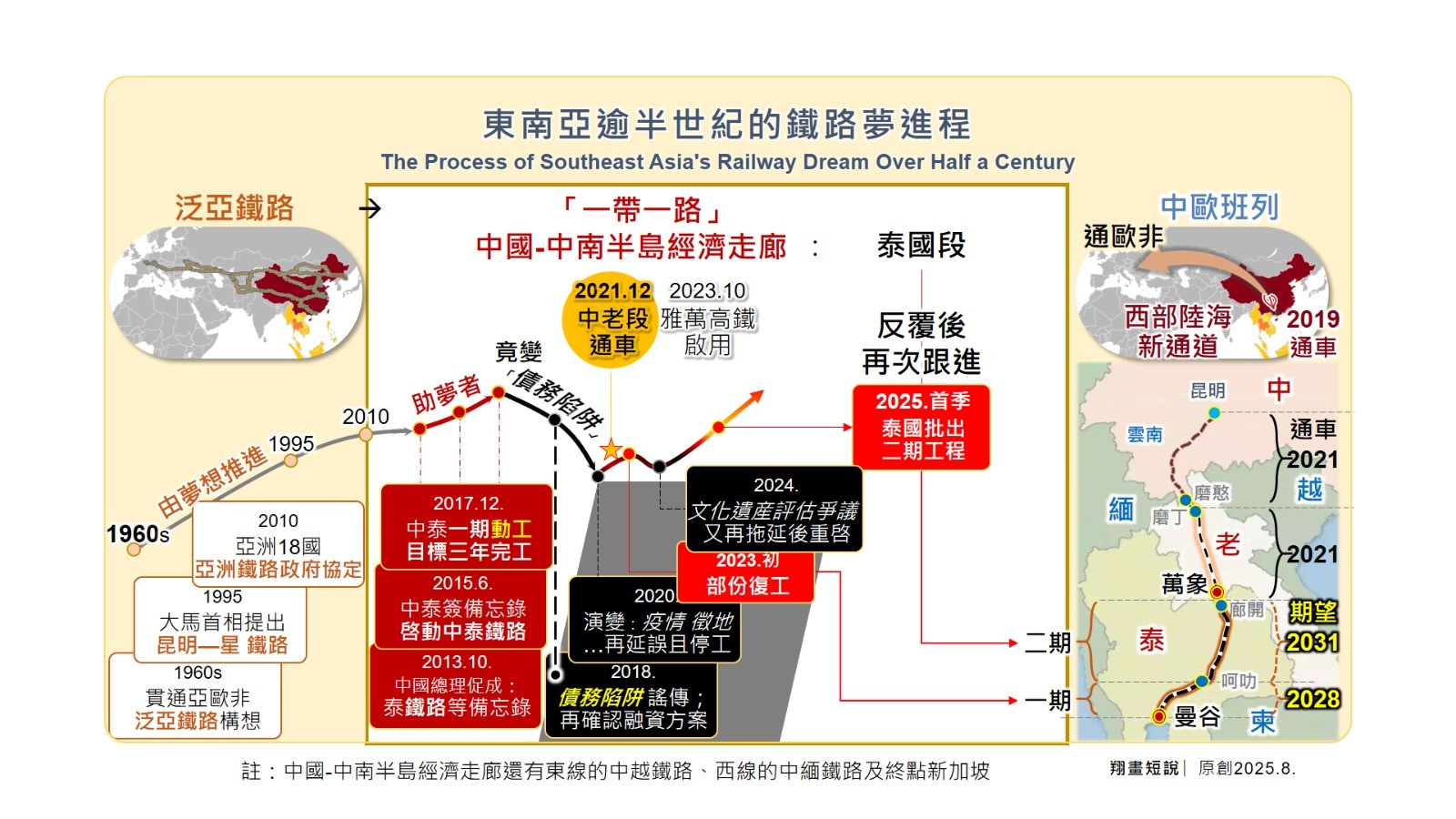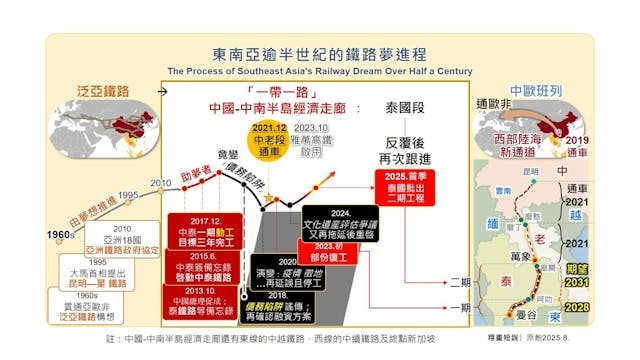 2013中國時任國務院總理李克強訪泰簽署首份備忘錄,2015年兩國再簽《中泰鐵路合作備忘錄》;2017年底第一期動工,預期三年內完成;但在2018年重新商訂融資安排,社會氣氛反覆,2020年更因疫情、政府更迭停工,迫使泰政府放棄中方貸款(未終止合作)。分析因由,學者對2013至2018年《泰叻報》131篇中泰鐵路報道分析指出,「債務陷阱」 相關輿論引發社會對中方貸款利率高、土地開發權爭議等質疑,迫使泰政府放棄中方貸款(而非完全終止合作),導致項目工期推遲。資料來源:陶雲,〈泰國主流媒體對中泰鐵路合作項目的通報分析 — 以《泰叻報》爲例〉,2019年9月5日(網址:https://m.fx361.cc/news/2019/0905/19276489.html)