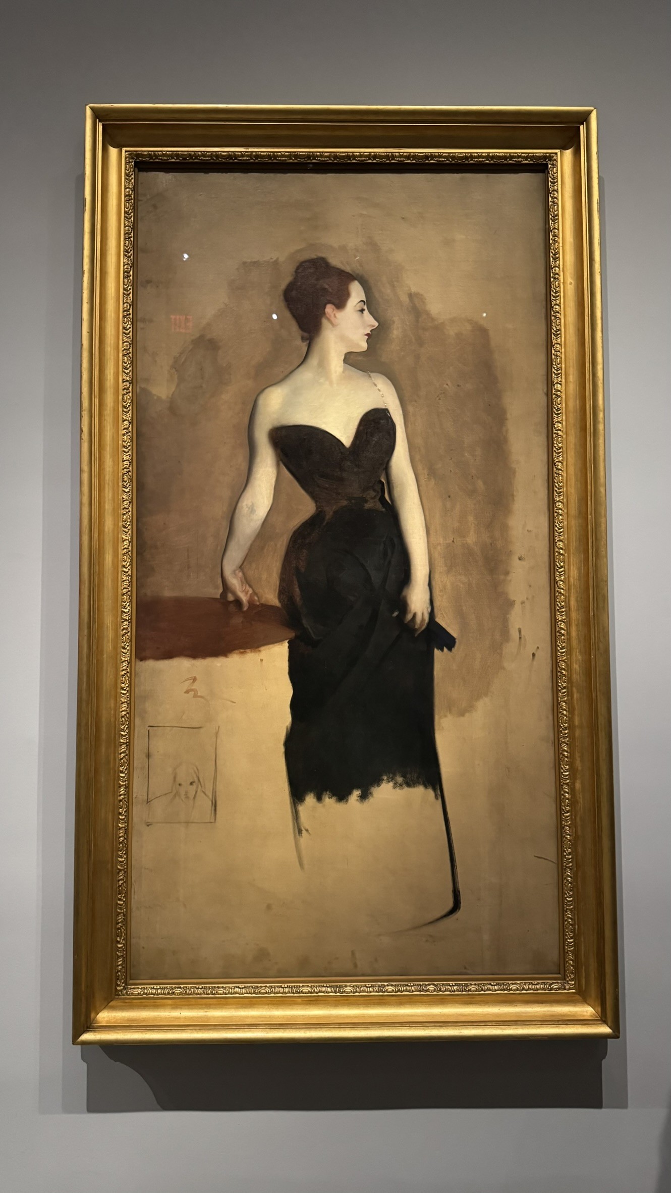到了展覽的中期,《鍍金年代》第三季正式上線,隨着此劇熱播,吸引大量觀眾入場欣賞。在眾多畫作中,最吸睛的是薩金特的代表作、大都會的館藏之寶──《X夫人》(Portrait of Madame X)。這幅畫是藝術家早期的巔峰之作,也是他自認最好的作品之一。 這位「X夫人」其實有名有姓,即是當年巴黎時尚名媛維吉妮·阿梅莉·阿韋尼奧·高特羅(Virginie Amélie Avegno Gautreau, 1859-1915)。她於美國南部新奧爾良出生,帶着娘家財富跟一位法國銀行家結婚後,就一直活躍於巴黎上流社會。薩金特被她的美貌和魅力深深吸引,在大量的速寫和草稿準備下,終於在1884年完成了高特羅的側面巨幅肖像。