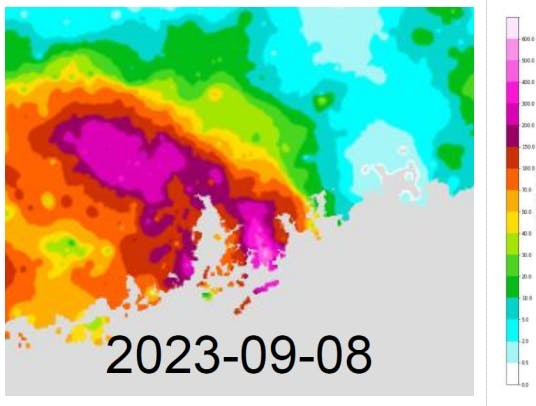 天文台利用EPS系統,模擬2023年9月7至8日的破紀錄黑雨事件。圖十顯示9月8日香港及鄰近地區的日雨量,可見珠江三角洲大片面積錄得超過200毫米雨量,但超過500毫米的暴雨區則集中在香港島及其下游(香港島以北)地區,最高雨量達622.5毫米,地形影響非常明顯。