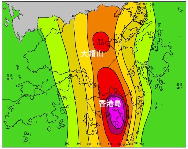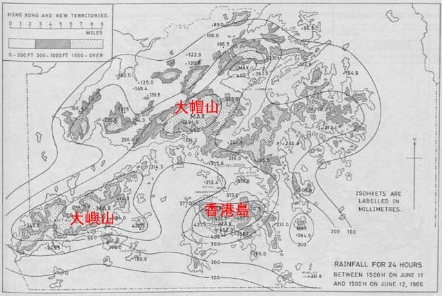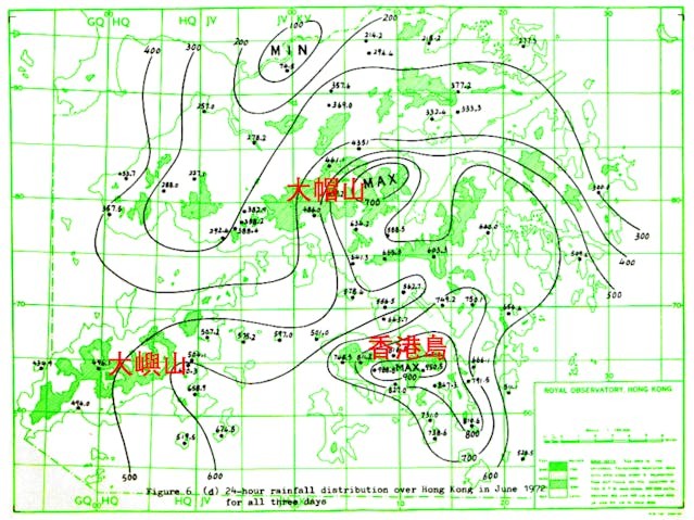 香港山多,地形複雜,現今最先進的業務電腦物理模型的精度仍然未能準確分析這些複雜地形的影響,我們認爲這就是香港暴雨難測的主因。筆者翻查了香港幾次的歷史雨災的雨量分布:一、1966年6月12日的「六六雨災」(圖四);二、1972年6月16至18日的「六一八雨災」(圖五);三、2008年6月7日的破紀錄黑雨(圖六);四、2023年9月7至8日的破紀錄黑雨(圖七),都發現暴雨中心與香港的地形(尤其大帽山、大嶼山及香港島)有密切關係。