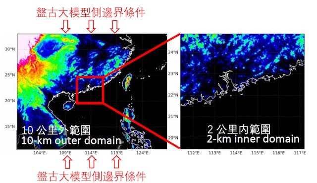 香港天文台高級科學主任黃偉健(圖八)報告了天文台最新發展的一套由AI驅動的高精度區域數值集合預報(EPS)系統。AI是採用盤古氣象大模型,提供初始條件與側邊界條件,驅動10公里和2公里套網格區域模式(圖九)。模式亦將全天空衛星輻射(All Sky Satellite Radiance)資料同化。系統有30個集合成員,基於這30個成員不同的預測結果可以計算出雨量預報的概率。