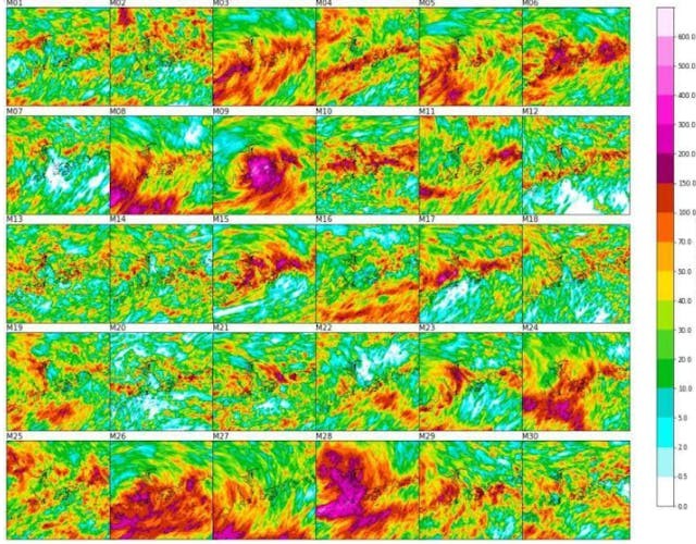 圖十一顯示各大全球電腦模式在一日前對於9月8日的預測雨量,沒有一個模式能預測得到香港會出現大雨。相比之下,香港天文台EPS系統對於9月8日的30個集合成員雨量預測中,有多個預測都能夠顯示香港會出現大雨(圖十二);其中一個(集合成員M9)更預測香港會出現超過500毫米的雨量,可見天文台這個結合AI模型和高精度數值預報模式的嶄新方法,在預報2023年9月7至8日的破紀錄黑雨事件,比全球電腦模式更為優勝。但是能夠預報香港出現幾百毫米暴雨的集合成員始終只屬於少數,這些預報(例如集合成員M9)亦未能掌握雨量的實際分布以及暴雨與地形的關係。無論如何,香港天文台這個創新方法已為未來更好地提前預報暴雨提供了希望。
