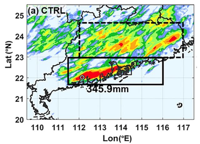 來自美國科羅拉多州立大學的Kristen Rasmussen教授(圖二)的研究揭示,華南沿岸的山脈雖然不高,但對於暴雨發展起了關鍵的作用。她與中國内地研究團隊做了一個暴雨模擬實驗,發現沿岸山脈引致暴雨帶集中於沿岸地區(圖三 A),但當沿岸山脈在模擬實驗中被移除後,雨帶除了移入内陸外,沿岸的雨量減少了一半之多(圖三 B)。