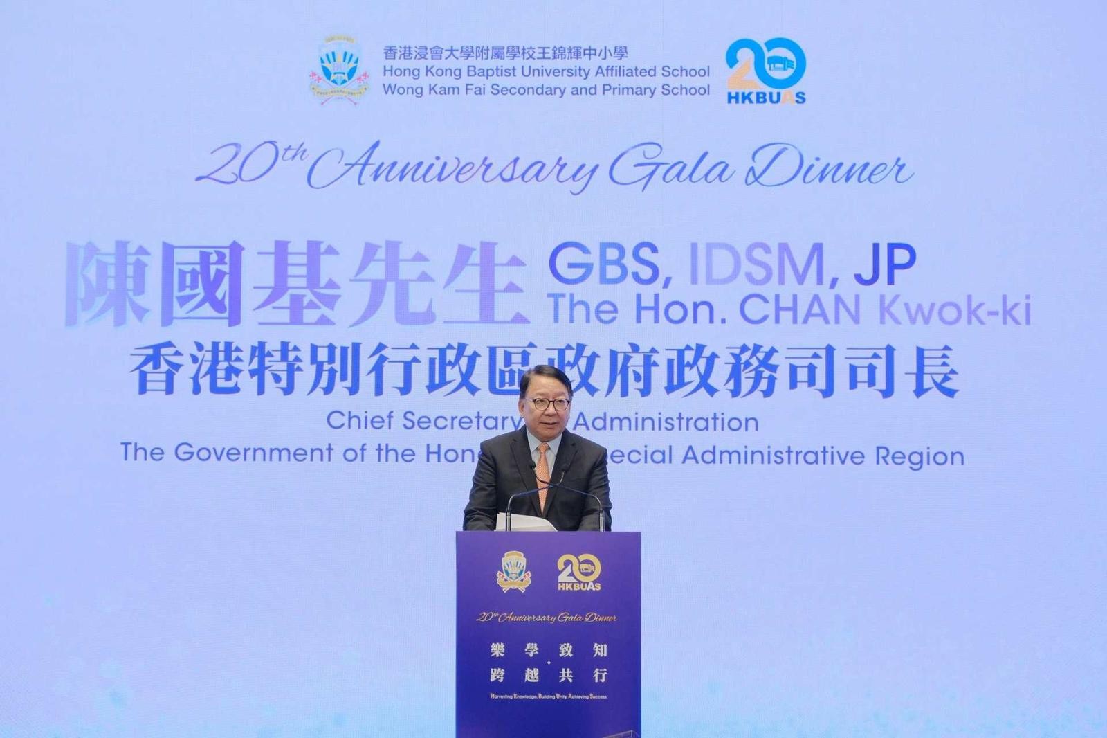 政務司司長陳國基致辭時指出,該校為本港首間由大學營辦的一條龍直資學校,秉承浸大教育使命,以「敏求篤信 明辨力行」為核心價值,培養具學術卓越、具創新思維及國際視野的人才。他表示:「學校不僅學術成績斐然,畢業生獲全球頂尖學府錄取,更透過與內地姊妹學校交流、航天員分享等活動,深化學生的家國情懷。」他重申特區政府將持續投放資源,配合國家科教興國戰略,培育德才兼備的新一代。
