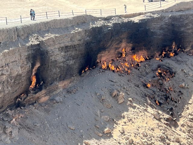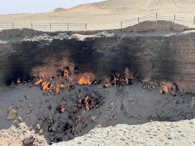 正值中午,赤日炎炎似火燒,我們下車後,逐步走近這個「火焰洞」,一如傳說,巨坑中的火苗仍在不住的燃燒,坑底滿布黄泥、石塊、砂礫,紅彤彤的火光,讓人不敢逼視……我繞着地獄之門,緩緩地走了一圈,坑中橘紅的焰火往上躥,閃爍不定,燒得讓人的臉發燙,陣陣熱風吹來,連呼吸也感到有點吃力。魅火長生不滅,恍如舞動的精靈,有自己的語言,也有自己的喜怒哀樂,既神祕卻又令人着迷……
