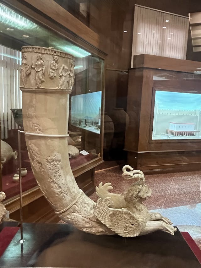 國家歷史民族博物館一大亮點,就是在尼薩(Nisa)古城遺址發掘出來的文物,存放於帕提亞古國(安息王國)展廳內,而最矚目的展品,就是象牙「角杯」(Rhyton),據悉出土的角杯有46個,半數去了俄羅斯,23個則留在這裏。這種形似獸角的古老盛酒器,流行於歐亞大陸,最早可能以動物角製作而成,後來也有陶器或金屬仿角牙形杯。角杯雕工精美,杯體外壁刻有各種觀賞圖案,大多與希臘神話及生活息息相關,如奧林匹斯12主神或《酒神的伴侶》的場面,題材和藝術風格雖來自希臘,卻滲入了中亞本地的色彩,是融合東西方文化的代表作。