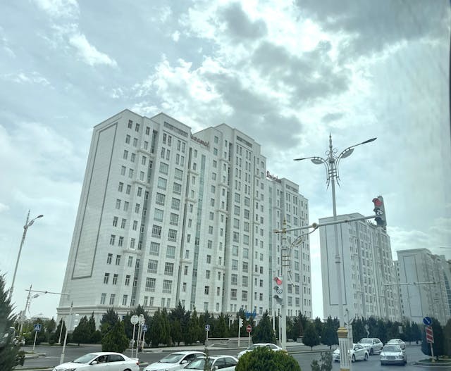 據說,土庫曼斯坦於1991年獨立後,政府便決意把首都建成世上獨一無二的白色之城,所有新的建築物,都由法國建築大師設計、土耳其人承建的。