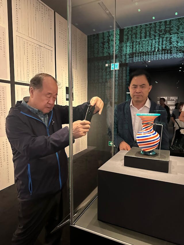 話說每座博物館都有自己的鎮館之寶,那麼香港故宮文化博物館最具代表性的藏品,莫過於那件「紅白藍玻璃瓶」──正式名稱為「乾隆款纏絲玻璃撇口瓶」。這件藏品,瓶身紋理酷似香港人熟悉的「紅白藍膠袋」,但其實是一件工藝極其繁複的清代玻璃製品。實物並不巨大,卻因其文化象徵意義與工藝價值而格外引人注目。莫言對之凝視良久,神情專注,彷彿文物也感受到知音的珍惜一般。