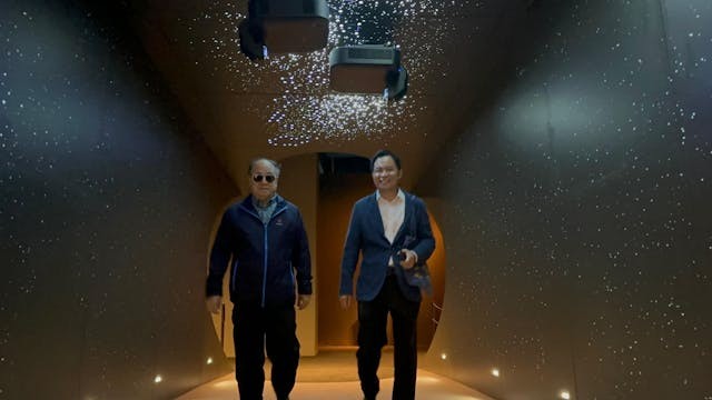 離開特展展廳,走進「古今無界──故宮文化再詮釋」展區。這裏以當代藝術手法重新詮釋故宮文物,透過多媒體及互動裝置,讓古老器物與現代對話。展區中有一條星光隧道,莫言與王振竟像孩童般,在光影中來回穿梭,笑聲在展廳裏輕輕回盪。隨後,我們轉入由私人收藏家捐贈的字畫展。王振對書法作品格外感興趣,不時與莫言低聲討論筆法與章法。莫言駐足於每一幅作品前,逐字細看,神情專注,彷彿在與千年前的墨跡對話。