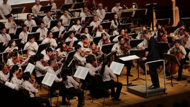 指揮比格米尼的指示,亦清晰而好看!整個Fanfare部分,學員在控制聲部之間的平衡與光芒、色彩,已可說差不多贏盡!令人非常意外!進入主題後,木管組整齊而高姿態的演繹,相當亮麗;弦樂組中的低音提琴組,旨在刻意強化音樂中短節奏的刺激,大概是筆者多年來首次聽聞如此的演繹!