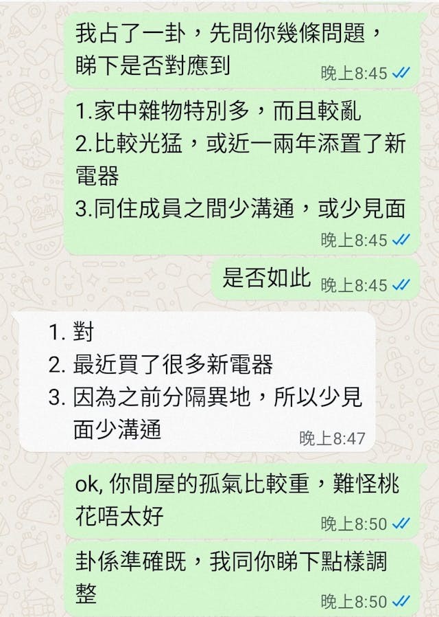 例如上述的風水卦例,一眼可以看出,家中雜物和情緒病有很大關係,而雜物和情緒病又和姻緣有很大關係。所以,如果要催旺姻緣,必須針對這兩個元素去布下風水陣。