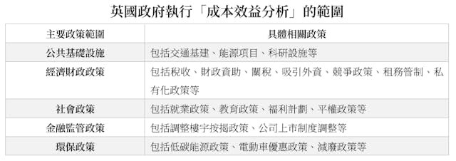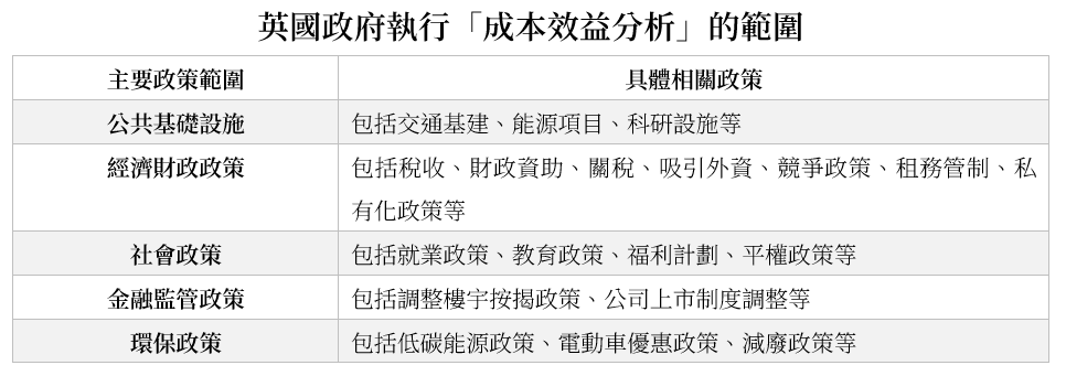 英國政府執行成效分析有較長的歷史,根據指引要求主要公共項目和政策提案都必須進行成效分析。以下簡介其應用範圍作為參考:
