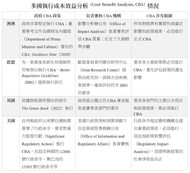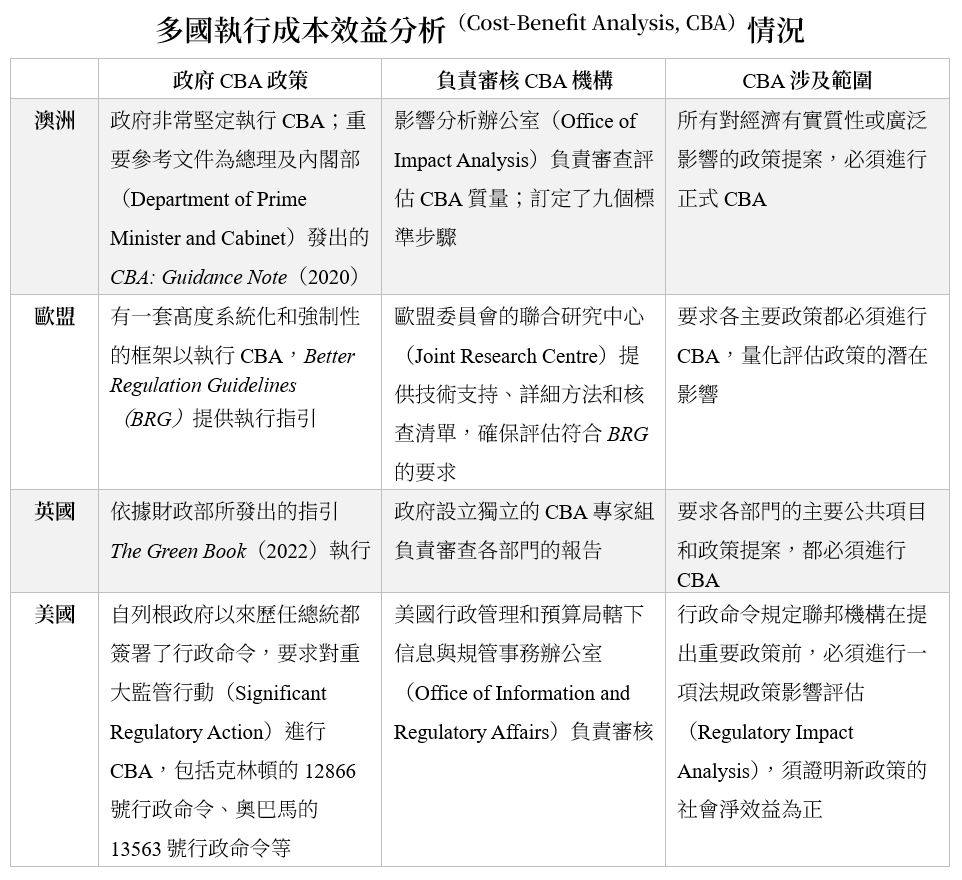 國際主要經濟體的政府已將成本效益分析深度融合為其公共決策的標準營運程序。這不僅僅是一項技術工具,更反映了重要的科學化管治理念,同時體現了促進社會福祉最大化、政策制定透明化的理想目標。