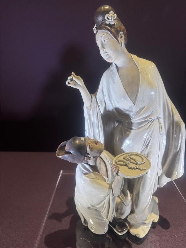 石灣位於廣州佛山,為什麼陶瓷會在澳門展出呢?這源於澳門有一位葡萄牙裔大律師文第士(1876-1931),他是國際上最早研究和收藏石灣陶瓷的有識之士。他1901年定居澳門,前後生活了30多年,酷愛中國文化,鐘情於石灣公仔,曾多次親到廣州和石灣實地考察,有系統地購藏明、清及民國時期的陶塑。