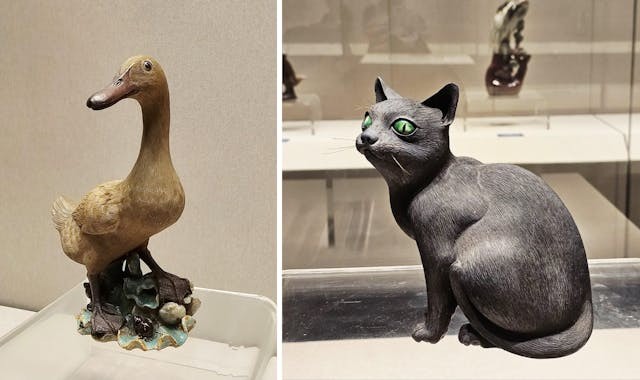 1920年,文第士特意向當時最負盛名的石灣陶藝大師陳渭巖及潘玉書訂製七個80厘米高的中國傳統人物陶塑,包括今次的重點展品華佗、陸羽和老婦人。這系列的陶塑都是栩栩如生,公仔的面貌極其細緻,表情豐富而逼真,尤其是眼睛造得特別傳神,各個人物的面貌神態都是活靈活現。其實要燒製80厘米高的大型陶塑是非常困難的,稍一不慎過了火,陶像便會產生裂紋;用火不夠則造型會走樣,所以大型陶塑的觀賞價值甚高!