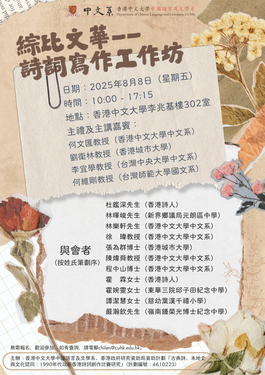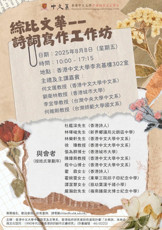 整理者按:綜比文華──詩詞寫作工作坊(第二次)由香港中文大學中國語言及文學系、香港政府研究資助局資助計劃「古典詩、本地史與文化認同:1990年代以來香港詩詞創作比賽研究」聯合主辦,2025年8月8日於中大李兆基樓舉行。當日開幕式由何文匯教授擔任主禮嘉賓,隨後由台、港兩地的學者及詩人發表研究及創作心得。筆者整理了何教授的開幕致詞,以饗讀者。