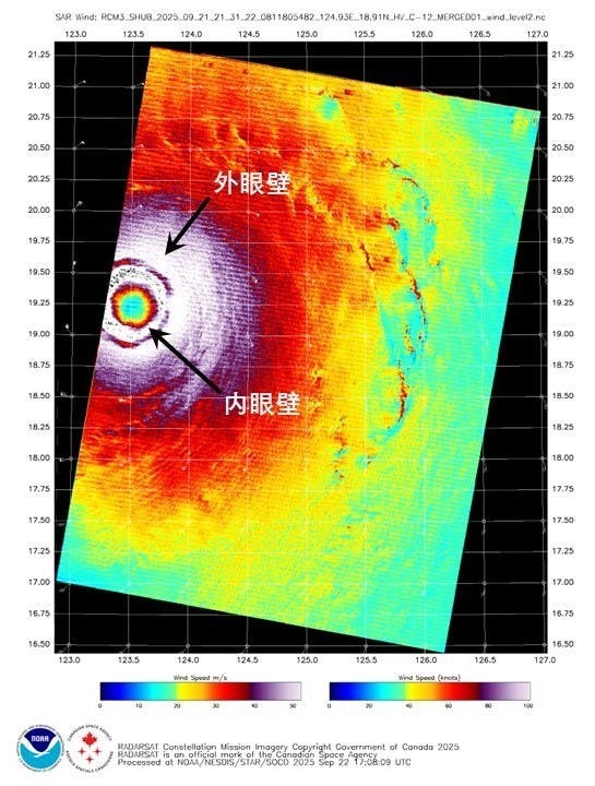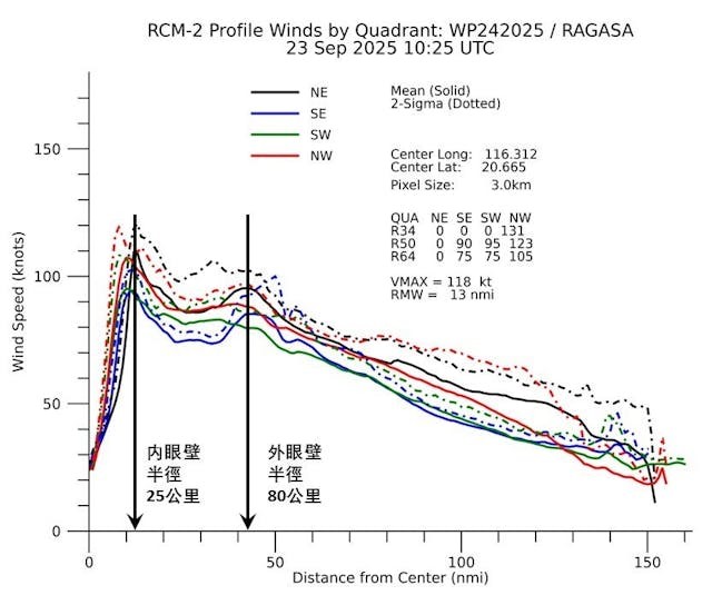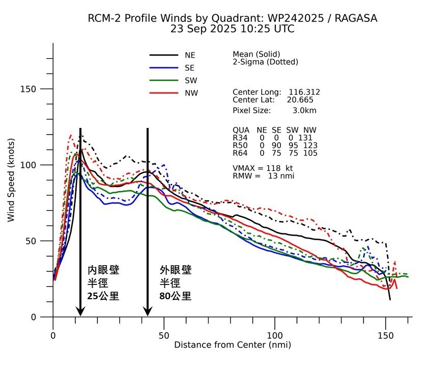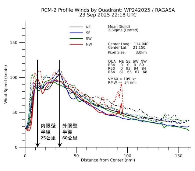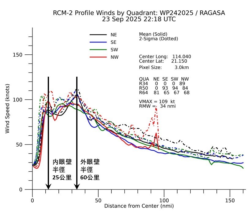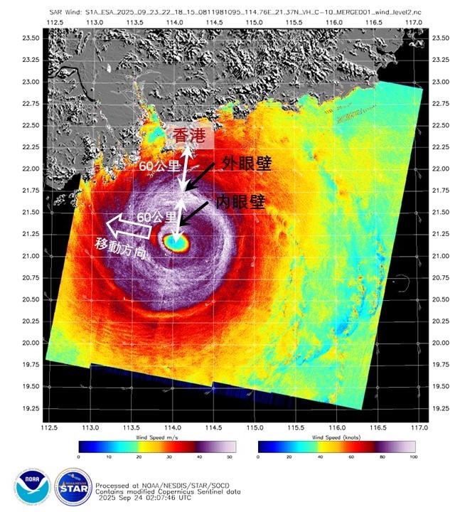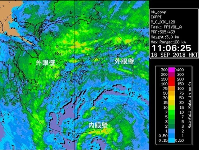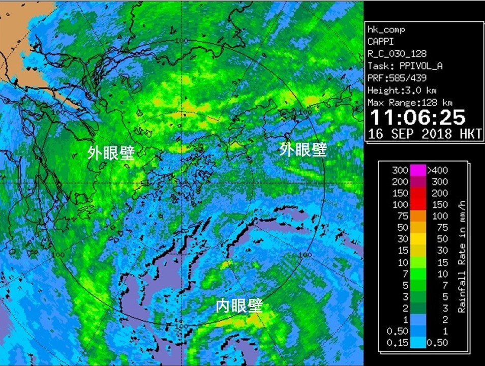 第二,樺加沙在橫過呂宋海峽前出現了眼壁置換(eyewall replacement),形成了雙眼壁(圖三)。颱風最大風速的區域就在這兩個眼壁附近,但在眼壁置換過程中,兩個眼壁的強度和大小會出現變化。筆者回想2018年吹襲香港的山竹,就是一個很好的例子;當山竹在橫過呂宋島進入南海後,受地形影響,山竹進行了眼壁置換,令原來較為細小緊密的眼壁(半徑約為50公里),被新形成大很多的眼壁(半徑約為160公里)所取代。結果,雖然山竹最接近香港時的距離達100公里,但它為香港帶來的風力比較為接近山竹的澳門更強勁。這證明香港當時受山竹較強的外眼壁影響,而內眼壁相對較弱(圖四)。