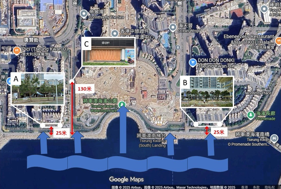 從以上觀察,筆者做了一些基本評估,發現被越堤浪摧毀的店舖(圖十一中的A及B區)只距離岸邊約25米,而在C區的店舖雖然離開岸邊約130米,依然有海水湧入。筆者希望這些數據可以幫助當局為受越堤浪影響的區域更有效地設計額外的防浪設施,以及在未來的「海岸管理計劃」中更好地規劃海邊的民居、商舖和其他設施,與海邊保持足夠的距離,減輕在未來可能會出現的越堤浪衝擊。