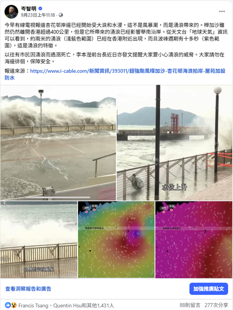 這裏我用「驚濤」和「駭浪」,是指樺加沙帶來的「湧浪」和「越堤浪」。在9月23日上午,當樺加沙還在我們400公里之外,強勁的湧浪已不知不覺間來到香港。筆者打開電視看見新聞報道杏花邨海傍已翻起巨浪,新聞報道員卻沒有作任何解説,深感不妙!於是便馬上在社交媒體提醒大家要提防湧浪的危險(圖九)。