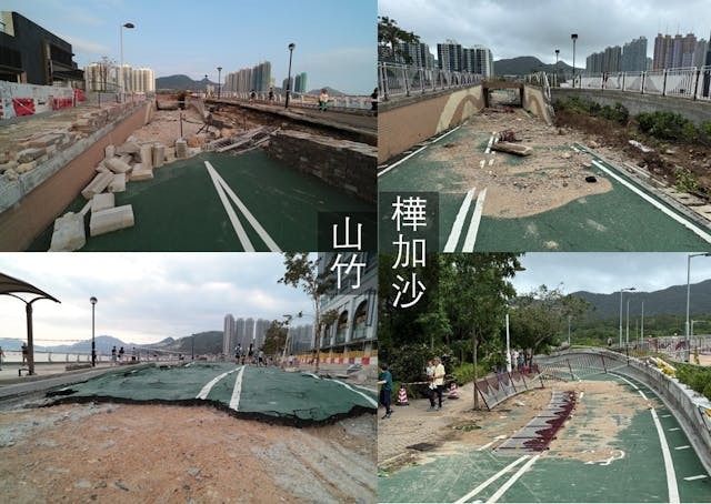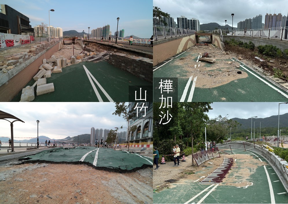 我住所附近的將軍澳海濱長廊便是其中一個屢次受越堤浪衝擊的地點:先有天鴿,再有山竹,今年又來了樺加沙。在山竹之後當局於海濱長廊外圍加建了約1米高的防浪墻,似乎能夠有效減低了樺加沙的越堤浪對單車徑的破壞(圖十),但對於近海的餐廳商舖,卻顯得不足。