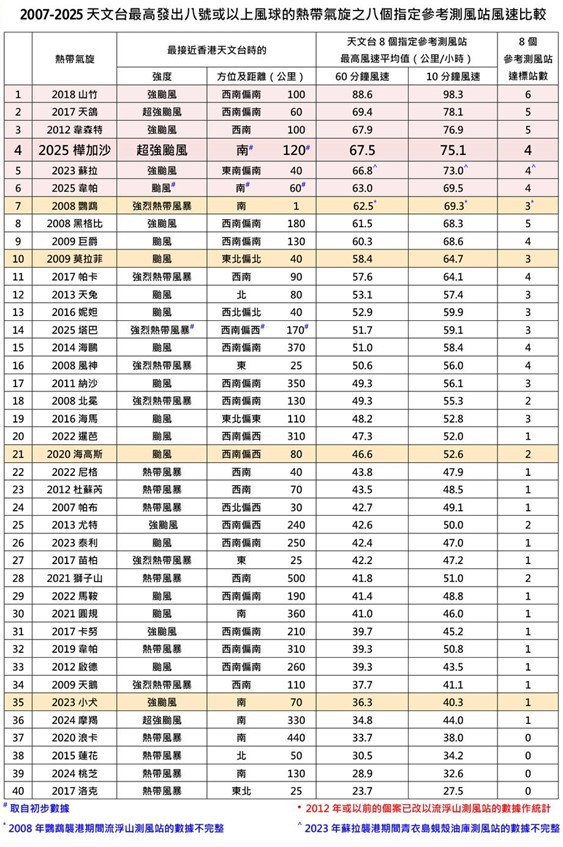 眾所周知,樺加沙為香港帶來的風力比山竹弱,根據民間氣象組織「香港地下天文台」製作自2007年以來的熱帶氣旋平均風力排名表(圖一),以天文台八個指定參考測風站計算,樺加沙排名第四,比山竹所帶來的平均風力低24%。