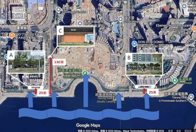 筆者在樺加沙來臨前特意在將軍澳海濱長廊一帶觀察,發現當局已在主要出入口設置沙包、水馬和擋水板;但餐廳商舖卻各施各法:有商舖只在玻璃大門貼上膠紙;有餐廳在大門前加裝1米多高的擋水板;亦有餐廳安裝厚木板把大門完全密封(圖十一中的C區)。