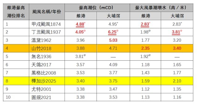 樺加沙為香港帶來的影響比預期低的第三個原因,就是風暴潮也比預期低了不少。香港天文台原本預測風暴潮所帶來的增水約2米,最高潮位普遍可達海圖基準面以上約3.5至4米(即3.5至4.0mCD),而吐露港潮位更可達4至5mCD。這是相當於天鴿、山竹甚至溫黛級別的水位高度(圖八)。但最終樺加沙帶來的風暴潮分別為3.40mCD(維港)和3.75 mCD(吐露港),在歷年的維港最高潮位排名榜僅佔第八位。