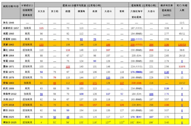 與前一期分析韋帕一樣,筆者製作自1946年以來引致發出十號颶風信號的颱風為香港不同地方帶來的風力和最高潮位,及其所引致的死亡人數,以作綜合比較(註:樺加沙的風速為初步估算,最終數據有待天文台公布)。筆者在圖二中將最高和最低值分別以紅色和藍色標示;有雙底線的是最高/最低值,沒有雙底線的是第二最高/最低值。可見樺加沙為香港帶來的風力,無論是平均風速或是陣風,都比山竹低約20%至30%。樺加沙所帶來的風力與韋森特和天鴿比較接近;與韋森特可謂叮噹馬頭,但略低於天鴿。