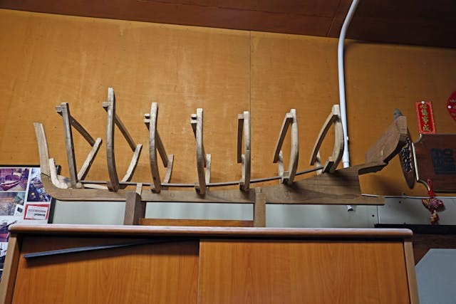 完成結構工程後,需通過海事處再次檢查,才能進入船底框架的製作。這一部分尤其考驗匠人的功力。區世傑解釋,彎曲的船側木板稱為「旁」,旁與旁之間的接合必須精準無誤,連0.5厘米的誤差都可能導致無法接合,甚至使船身漏水。因此,切割與彎折木板十分講究工匠的耐心與專注力。