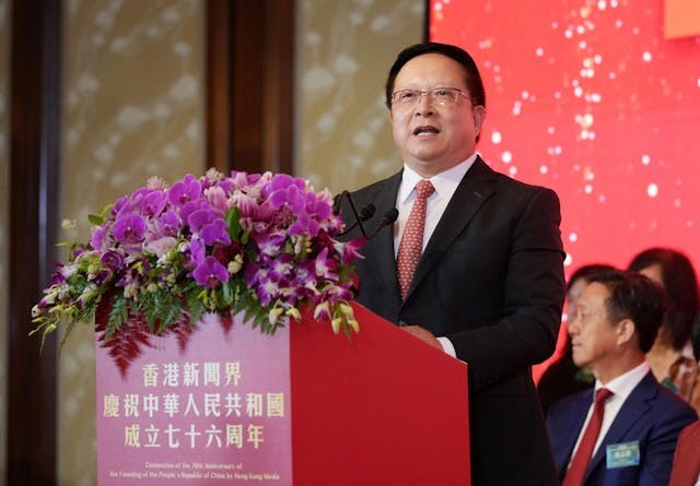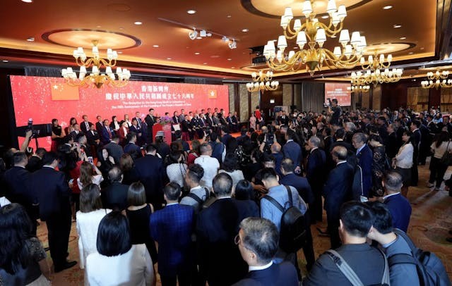 10月9日,香港新聞界慶祝中華人民共和國成立76周年活動隆重舉行。行政長官李家超、中聯辦主任周霽、中央駐港國安公署副署長陳楓、外交部駐港副特派員花有、解放軍駐港部隊副司令員譚志偉、政務司司長陳國基、財政司司長陳茂波、紫荊文化集團董事長許正中,香港新聞界國慶籌委會主任委員、香港新聞工作者聯會主席、香港大公文匯傳媒集團董事長李大宏等出席主禮。近500名社會各界賢達與新聞界同仁齊聚一堂,祝願祖國繁榮昌盛,香港社會穩定發展。