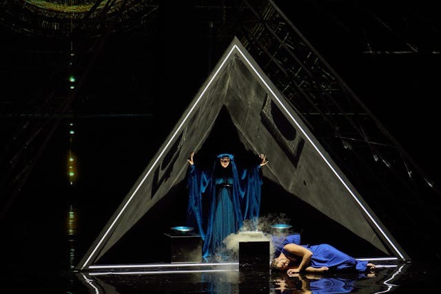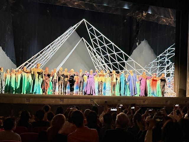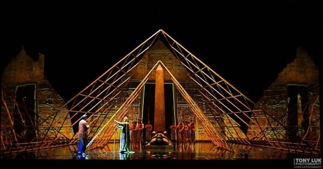 舞台上閃耀着金光,燈光下還有藍色、紫色、綠色和紅色熠熠生輝,男主角渾厚透亮的聲音唱起「聖潔的阿伊達」,一個大三角夢幻般立體舞台設計,用藝術還原了古埃及的背景,深深吸引觀眾。