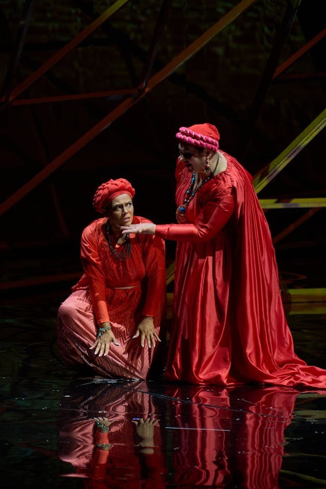 筆者整晚都被女主角的歌技深深吸引,這首場的演員女主角阿伊達,是來自來自意大利的Maria Teresa Leva,這位舞台經驗豐富的女演員唱功了得。她的詠嘆調拿捏有度,收放自如,二重唱、三重唱都是自然炫技,毫無做作,特別是唱到要點處,聲音穿透力滿在頭腔,卻又可以突然收回下嘆,在喉嚨腔體裏抖動纏繞,令聽眾極度過癮。她甚至在大合唱中都能一枝獨秀,對抗樂隊及合唱團強大聲量,卻又不會覺得她費力,整個過程自然流暢。