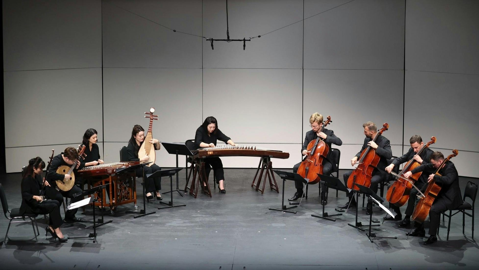 接着兩首世界首演,俱為四把大提琴和中樂五重奏組成的九重奏創作。首先是波蘭作曲家Tomasz Skweres的《倉頡》,巧妙以大提琴奏出倉頡造字的氛圍,張瑩獨奏調低四分一音的琵琶幾乎遊走全曲,配以高胡滑音、大提琴長音等音效,描繪傳說中的過程。