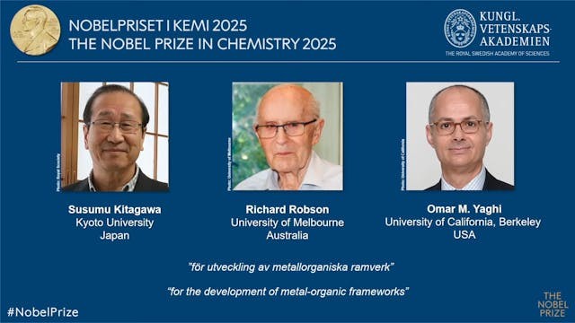 日本京都大學學者北川進(Susumu Kitagawa);英國材料學家、澳洲墨爾本大學教授羅布森(Richard Robson);美國化學家、加州大學柏克萊分校教授亞基(Omar Yaghi)榮獲2025年諾貝爾化學獎,表揚他們在金屬有機骨架(metal-organic frameworks,MOF)的研究成果。