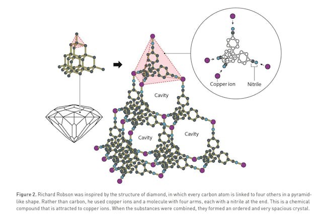 羅布森在1989年以正電的銅離子作實驗,開發出由銅離子組成的新的分子結構MOF。此分子結構極具潛力,但它不穩定,容易崩塌。